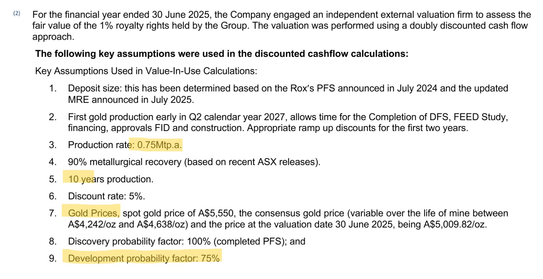 But take a look at the assumptions in that valuation. Initial production rate will be 0.9Mtpa and expected to grow per Rox’s DFS. The gold price is conservative. Development probability should be 100% not 75% now Rox has largely equity-funded most of the capex.