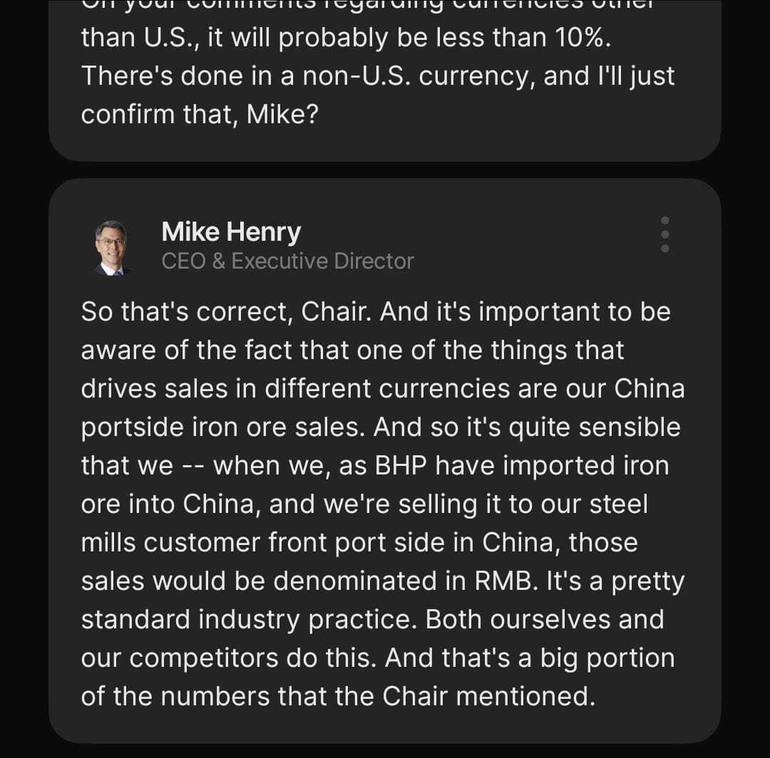BHP was asked directly at their AGM yesterday what percentage of total sales are sold in another currency. It’s worth listening to the response if you’re still paying attention to the RMB story. But here’s Mike Henry’s words on the matter.