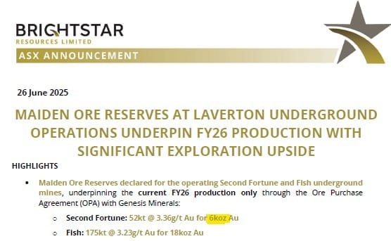 Brightstar reported maiden ore reserves for Second Fortune and Fish, containing 6koz and 18koz respectively (BTR)