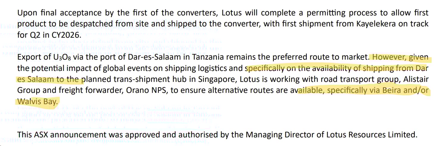 LOT ($451m) - Lotus said Kayelekera is ramping with 80% utilisation in Feb (65% milling, 82% recovery), acid plant cold commissioning underway, targeting nameplate and first converter‑accepted U₃O₈ shipment in Q2 CY26